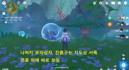 보라상자, 진흙구는 지도상 서쪽 연꽃 위에 있음. 작은 상자는 남쪽에 개울 건너 풀잎 위에 있음. |