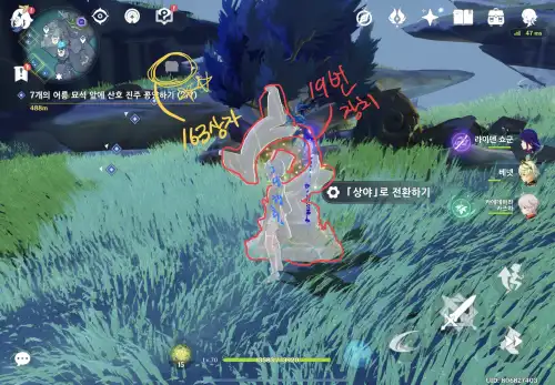 z키 누르고 소루쉬 변신해서 주황색 클로버 인장에 날아가서 e키 누르면 소루쉬가 클로버 회수함. 눈동자로 날아가서 T키 눌러서 다시 설치후 z키 눌러 캐릭터 모드 복귀후 인장타고 날아가서 획득. 절벽끝 우측 아래로 255 눈동자도 있음 |