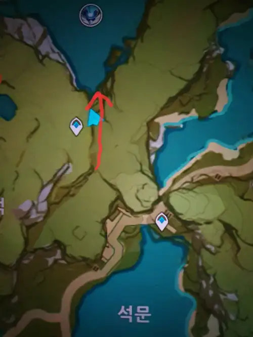 석문등지고 위로 쭉 올라가다보면 물에 겁나 큰 네모바닥 보임. 그럼 거기서 바로 바닥으로 떨어지면 있습니다. (지도는 산 위에 있는거 처럼 표시되어있는데 아님) |