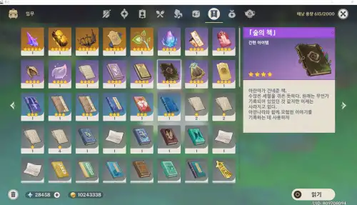 아이템배낭 안에 느낌표(임무) 탭 에서 4성짜리 아이템인 '숲의 책' 읽기 |