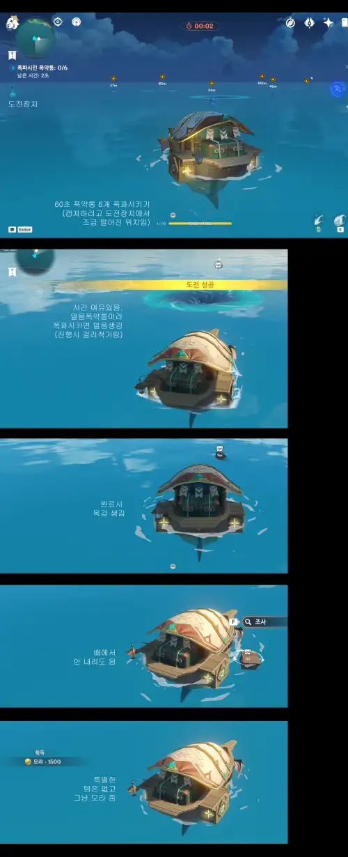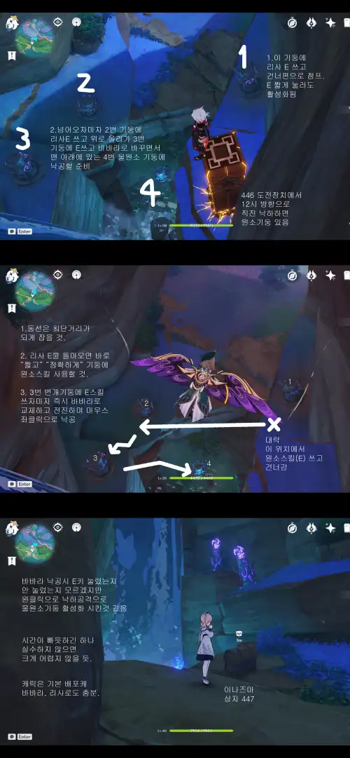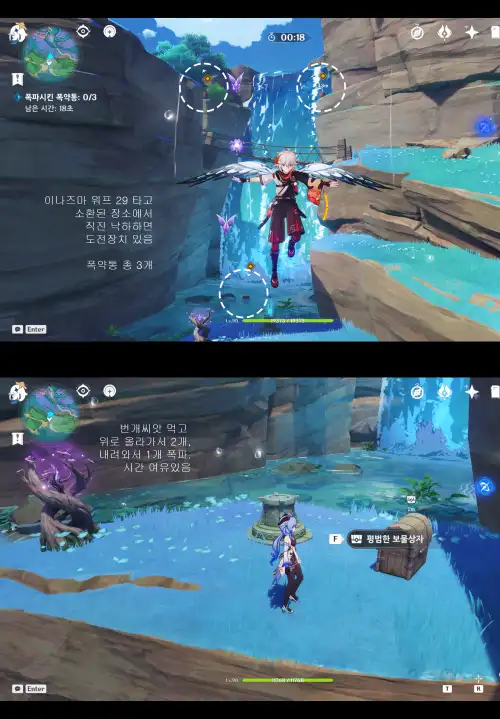 도전장치 건드리면 11시 보면서 시작함. 2개 먹고 착지하는 곳에 번개씨앗있음. 묻히면 뒤쪽에서 견인줄 생겨서 땡겨감. 이때 전진키 누르면서 날아가서 3번째 먹음 . 위에서 또 땡겨가는데 날아가서 착지하고 왼쪽(언덕끝)에서 4번째 먹고 오른쪽으로 돌면 조그만 폭포줄기 위에 5번째 있음. 잘 날아가면서 먹고 직진하면 나머지 2개 보임. 3번 5번 컨트롤과 4번 5번 위치파악만 잘해주면 쉬움. |