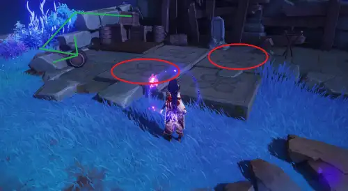 불이 다 꺼져있는 발판에서 동그란 표시 발판 밟으면 풀림 (초록색 화살표는 반대편 불 들어와있는곳에서 열로 보라는 표시) |
