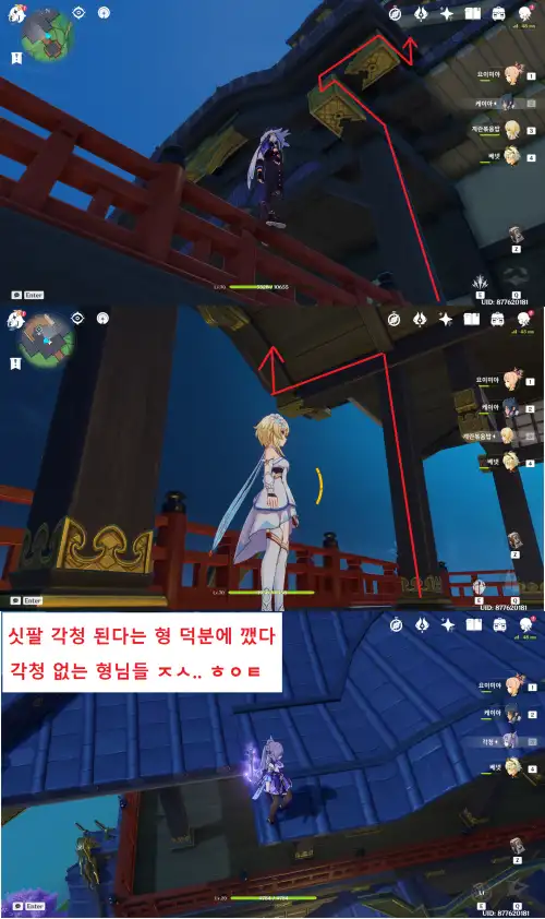 1. 1층 플랫폼에 빛 4개를 쏜다. 2. 가운데 빛 쏘는 장치를 돌려서 큰 기둥에 빛을 쏴준다. 3. 모래시계를 키면 클로버인장이 나오는데 그걸 타고 2층 플랫폼에 가서 빛을 빨간색으로 바꾼다. 4. 2층 플랫폼에서 빛을 쏘는 장치를 돌려서 큰 기둥에 빛을 쏴준다. 5. 3,6,12시에 있는 빛 쏘는 장치 중 하나에 가서 올려준다(안기다려도 됨) 6.밑에있는 모래시계를 활성화시켜서 클로버인장을 타고 나머지 빛쏘는 장치도 올려준다. 끝. 그리고 기억이 잘 안나는데 혹시 1층 하다가 빛이 발판에 막혀서 안가면 발판 밟으면 사라짐. |