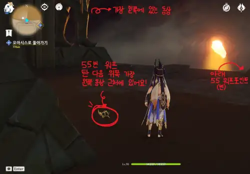 워프70번타고 나와서 보이는 오른쪽 하단 물흐르는 동굴 진입 후 왼쪽길 택해서 오면 됨 |