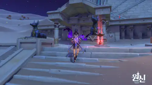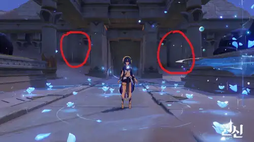 양쪽 벽에 고대신 그림 1개씩 있음. 각각 벽에 다가가 만지면 그림이 사라지면서 도금여단 2명씩 뜸. 양쪽벽 모두 만지고 도금여단 총 4명 처치하면 가운데 길에 상자 생김 |
