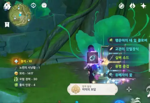 번개캐릭 하나 파티에 넣고 달리면서 기이한 꽃 보일때마다 계속 번개원소 쏴주면 환몽의 씨앗 빛기둥 나옴. |