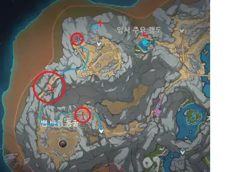 1: 선령위치 / 2: 열쇠를 얻을 수 있는 동굴 / 3: 철문 입구 / 4: 수정석 / 5: 출구 |