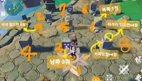 총 3번 풀때마다 상자나옴 재접하면 리셋되어있어서 세번풀면됩니다. 스도쿠 생각하면 쉬워요. 총 가로세로대각선 총 합이 15가되도록 풀면됩니다~! 움직이지 않는 블럭 자리랑 비석없는 9점짜리 스팟에 숫자가 이미 세팅 되어있는 상태라 거기서부터 맞추시면 더쉽게 접근할수있어요 |