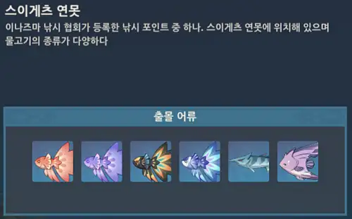 출몰 물고기 : 구피 , 유리 구피 , 노을빛 구피 , 수정빛 구피 , 부레 가시고기 , 자색 나비고기 |