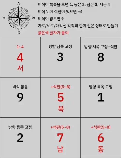 아무데나 같은 방향 X / 셋 다 지도상으로 북쪽을 봐야함 |