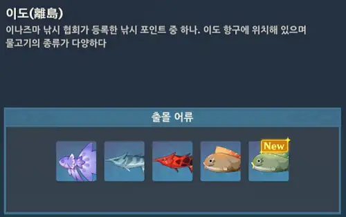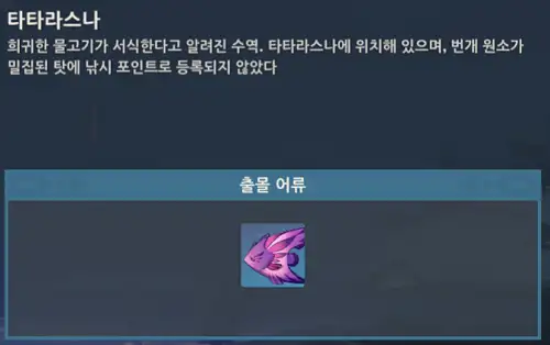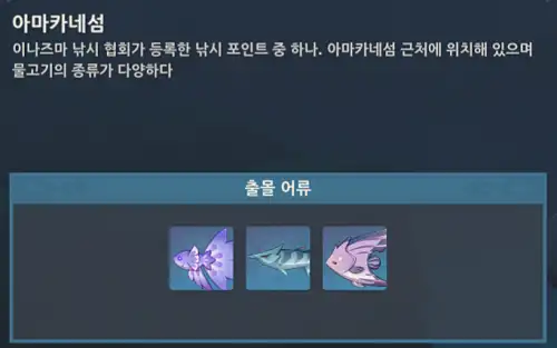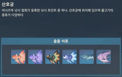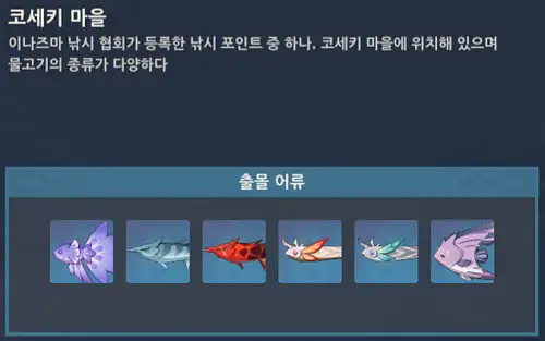 출몰 물고기 : 유리 구피 , 부레 가시고기 , 붉은 마왕 가시고기 , 금적빛 용 물고기 , 녹빛 용 물고기 , 자색 나비고기 |
