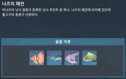 출몰 물고기 : 달콤달콤 구피 , 전투 가시고기 , 붉은 마왕 가시고기 , 금적빛 용 물고기 , 녹빛 용 물고기 , 갈색 나비고기 |