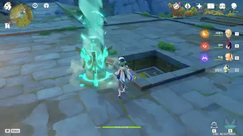 바람기둥 2개를 시간내에 켜야함. 발판은 천장의 철장을 열어주는거 |