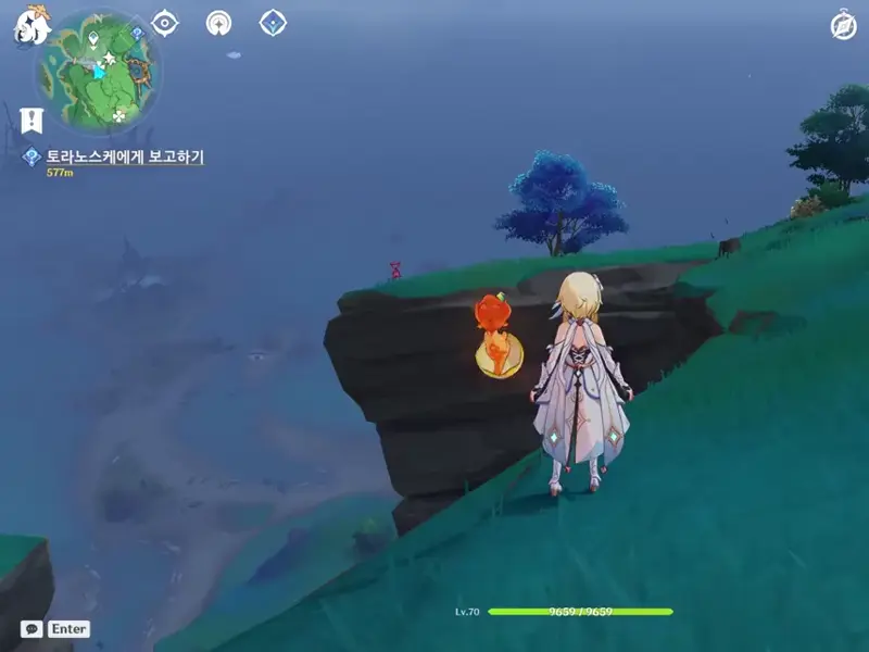 저 같은 경우 바위산 꼭대기까지 등반했습니다. 꼭대기 위에 물의 신 눈동자가 있고 츄츄족 바람걸음 순찰자 1마리 있는데 피하셔서 물의 신 눈동자 드시면 되요! 올로룬 같은 장신 캐릭터로 점프해서 드세요! 아니면 비행 이동기 가진 캐릭터로 드시거나! |